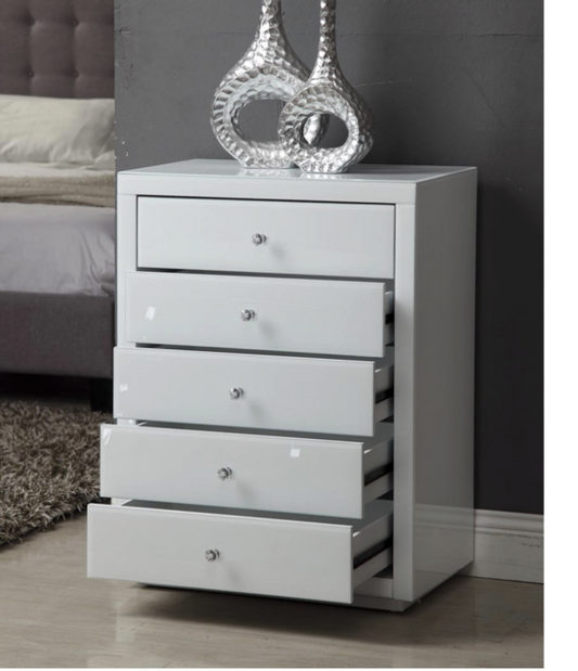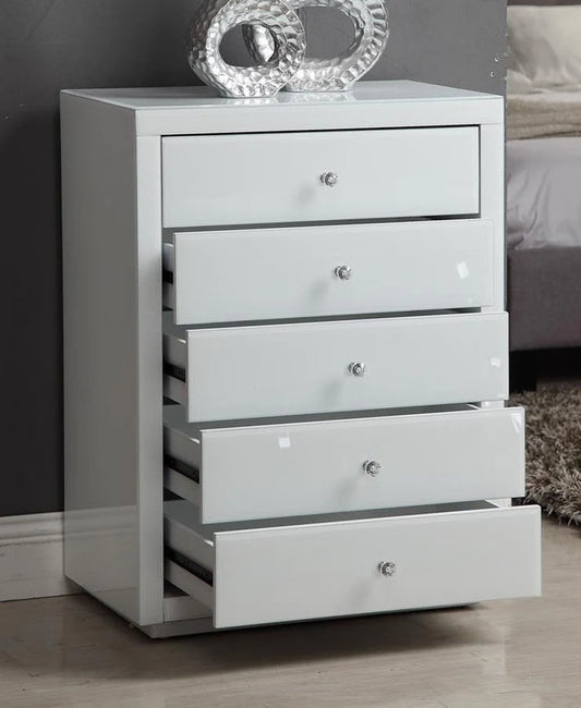 NEVADA White Glass Tallboy 5 Drawers with Crystal Effect Handle