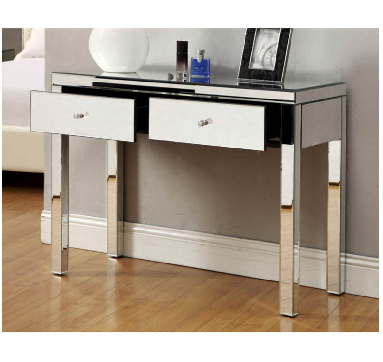- This Venetian & Contemporary Inspired, fully mirrored Reflections Mirrored 2 Drawer Dressing Table Console reflects light beautifully, making it an elegant, and practical bedside table to suit any bedroom. This is a unique and exclusive range.